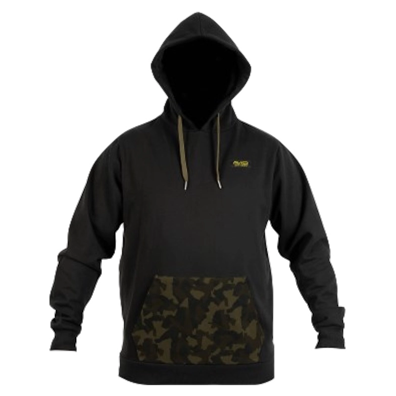 Štýlová a pohodlná čierna mikina s kapucňou, ktorá vyniká maskáčovým klokaním vreckom na prednej strane.