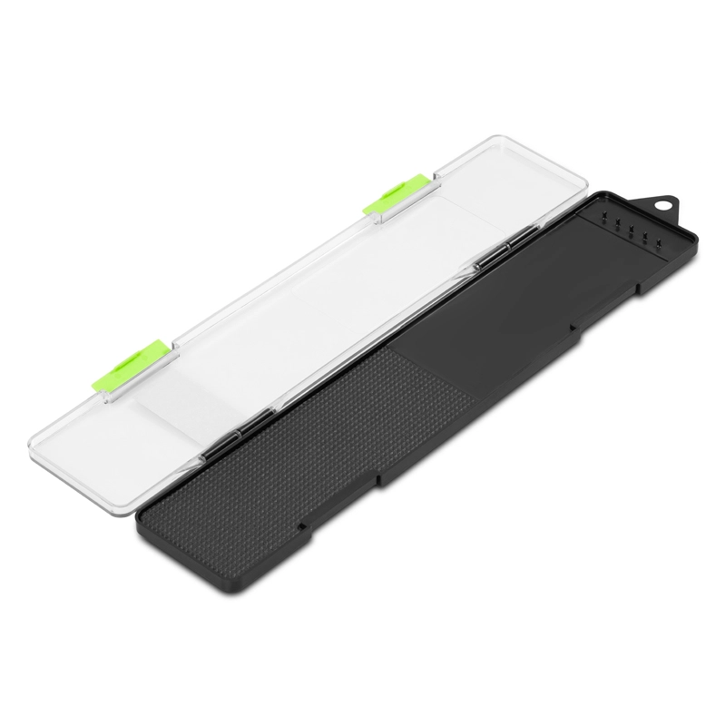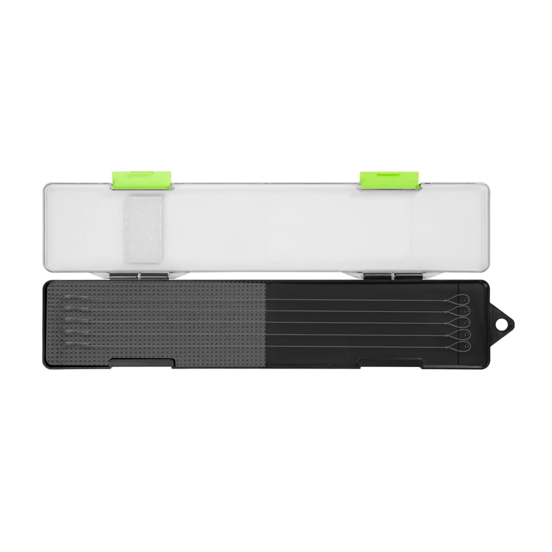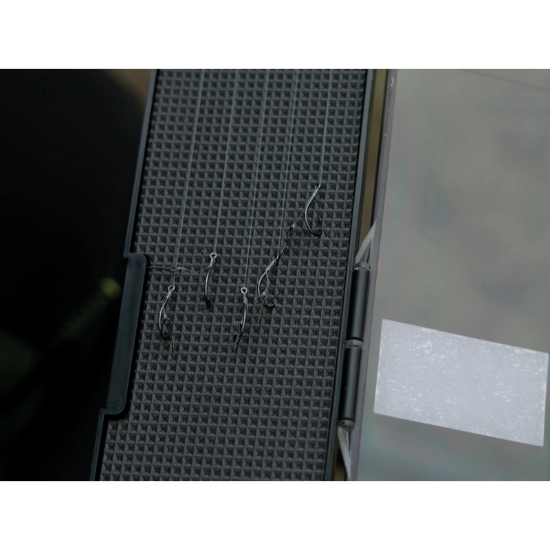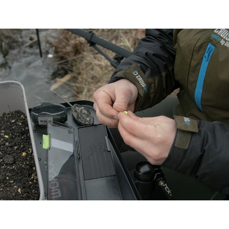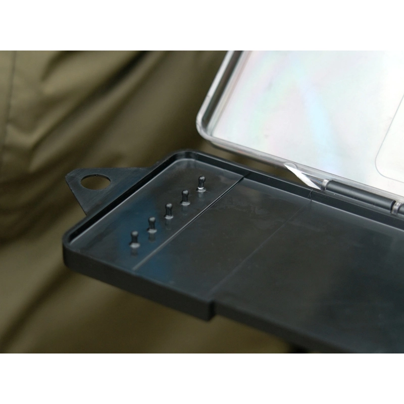 Telo boxu je vyrobené z odolného čierneho plastu, ktorý chráni obsah pred mechanickým poškodením. Vnútro je vybavené plastovými výbežkami na presné uchytenie slučiek a mäkkou EVA penou, do ktorej spoľahlivo zapichnete háčiky bez rizika otupenia ich hrotov. Vďaka dĺžke 303 mm je tento box ideálny na rôzne náväzce používané pri love na klasický feeder či method feeder.