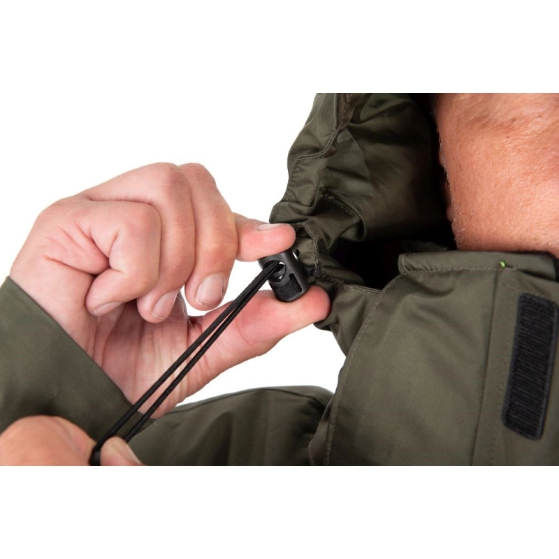 - Premyslené nastavenie strihu – pružná sťahovacia šnúrka v leme, nastaviteľné manžety a pružný pás so sťahovacími pásikmi umožňujú dosiahnuť priliehavý veter odolný strih.