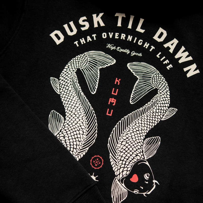 Po úspechu motívu Dusk Till Dawn prichádza tento ikonický dizajn aj na mikine. Kúsok pre nočnú posádku a pre všetkých, ktorí milujú lov od rána až do noci a pre ktorých ani nočný rybolov nie je prekážkou. DUSK TILL DAWN v preklade znamená od úsvitu do súmraku. Ručne kreslená grafika v bielej a kontrastnej červenej farbe, vytlačená na luxusnej látke s gramážou 320 g/m² s tkanými detailmi na bočnej pútke.