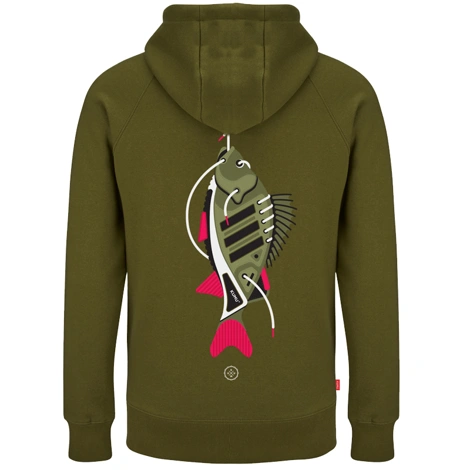 Mikina Earn Your Stripes je grafická pocta ostriežom („Stripeys“) a rybárskej trpezlivosti – motív kombinuje pruhy ryby s narážkou na úspech, ktorý si musí rybár zaslúžiť. Vyrobená z mimoriadne mäkkej khaki tkaniny s gramážou 150 g/m², s detailnou šesťfarebnou sieťotlačou a tkanými bočnými štítkami.
