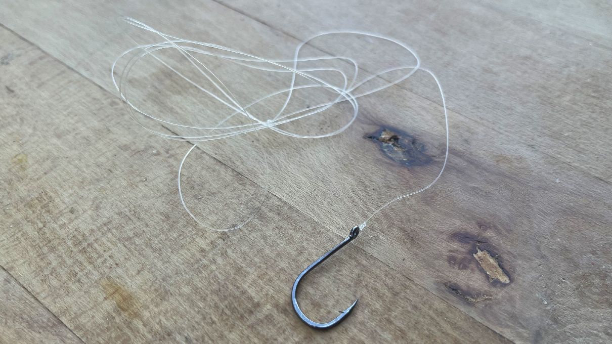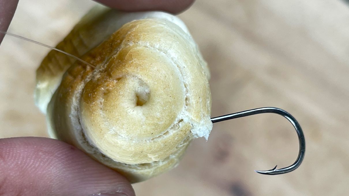 Ako nastražiť rožok na mlaskačku? Najprv háčik prepichneme jedným koncom rožku...
