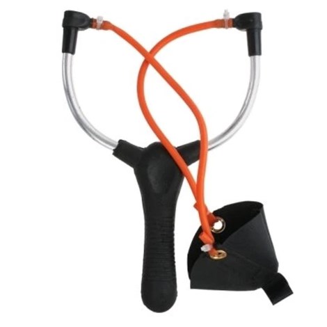 Pevný rybársky prak vybavený kovovým rámom a pevnými gumičkami zaisťujúcimi dlhý dosah.