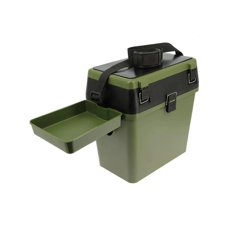 Sedací box pre aktívnych rybárov s úložnými priehradkami, bočným stolom, penovou podložkou pre pohodlie a ramenným popruhom pre ľahké prenášanie.
