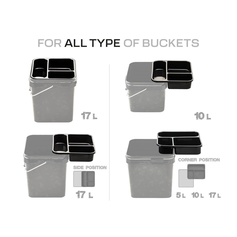Ideálne na prehľadné uloženie príslušenstva, návnad a kŕmenia. Vďaka lisovanej rukoväti sa ľahko vyníma a jej veľkosť je vhodná pre väčšinu 17l vedra.