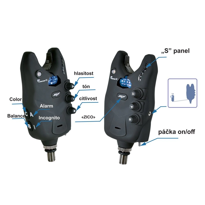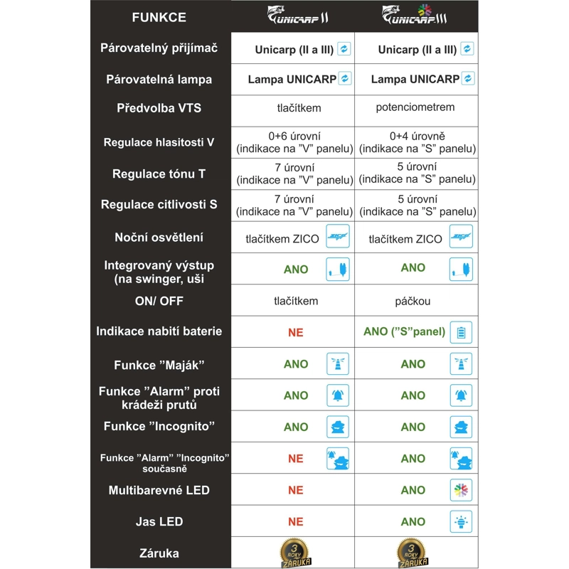 Výhodou Unicarpu III je, že nemusíte vyberať farbu do vášho setu, pretože na Unicarpe III je možné ľubovoľne prepínať farby - posledná zvolená sa uloží do nastavenia so svojou pozíciou kanálu na prijímači (max 6 farieb: žltá, zelená, modrá, červená, fialová, biela )